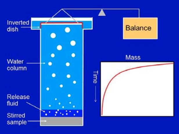 通過水柱上升的氣泡被收集到一個倒置的皿(浮皿)中,這個皿是浸在水中并且連接到一個靈敏的天平。當氣泡聚集在皿上時,由于水被空氣替代,皿的表觀質量會降低。皿的表觀質量會隨時間記錄下來。